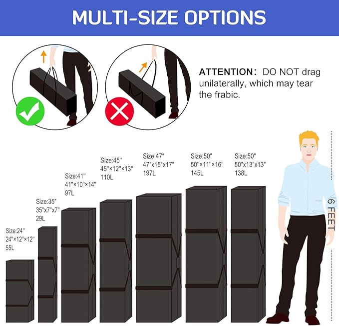 - LARGE CAPACITY: INFANZIA large-capacity duffle bag is one of the essential items for your travel. It can be used to store tents, clothing, sports equipment or foldable strollers. INFANZIA travel bags are available in 50*11*16 Inch/127*28*41 CM size to meet your travel needs