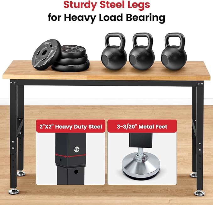 Work Bench for Garage Workbench Adjustable Height Work Table for Shop Woodworking, 60x 22 Heavy Duty Rubber Wood Top for Office, Home, Commercial