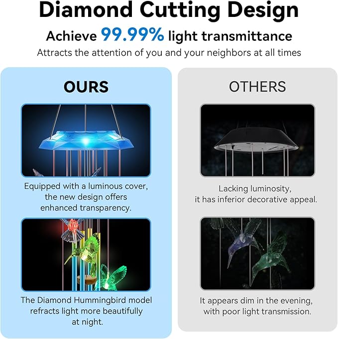 - 【Exceptional Light Transmission & 7-Color Changing Light】Our solar wind chime features an advanced diamond-cut hummingbird and solar panel design, achieving 99.99% light transmission. During the day, it sparkles like a diamond in the sunlight, and at night, the solar panel emits a soft blue glow while the hummingbird changing between seven colors: red, green, orange, blue, yellow, purple, and white. Add a touch of enchantment to your life.