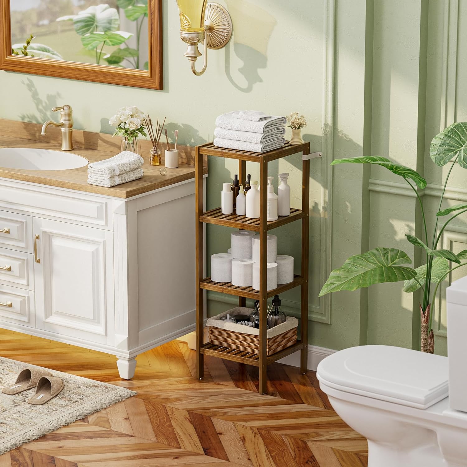 - β EASY TO ASSEMBLY & STURDY: With included illustration and tools, just follow the instructions and tighten the screws will set it up; All solid bamboo parts are fastened by galvanized screws, making this toilet rack very stable and wobble-free, each shelf holds up to 33 Lbs.