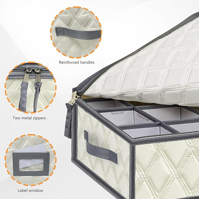 - Quality Material: Both the stemware and mug storage bins with 2 sturdy handles.They are hard shell constructed by thick hard cardboard covered with quilted oxford cloth, each with 12 compartments to keep your glasses/cups from bumping into each other. For 4 dish storage containers, we provide 12 free felt separators, in total 48 sheets for you to put between plates to prevent scratches. Please rest assured that they will provide the best protection for your fine/delicate and fragile dishes.