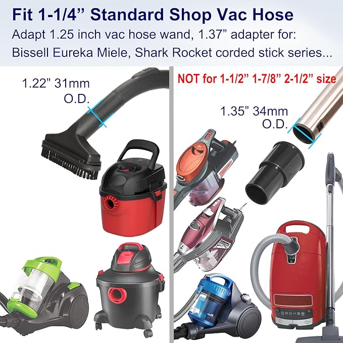 - 1 1/4" Car Detailing Kit with 1 3/8" Adapter: Only fit 1-1/4"(32mm) plus 1-3/8"(35mm) vacuum wand or hose; NOT for 1-3/4" 1-1/2" / 1-7/8" / 2-1/2". PLS check vac outer port ( less than 1.25" 32mm or 1.35" 35mm), PLS check it before order