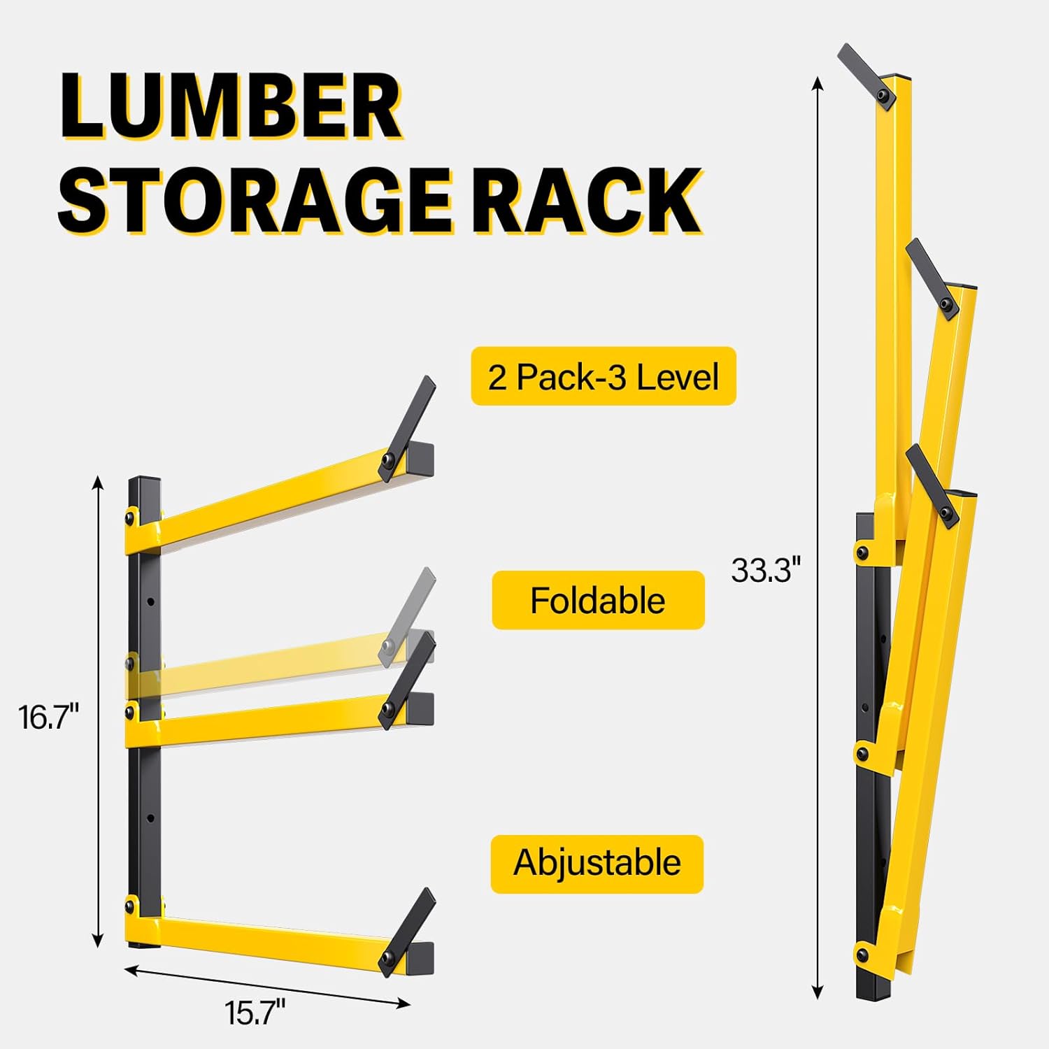 GREENER Lumber Storage Rack Folding Wood Storage Racks Wall-Mounted Metal Racks for Storage with 3-Level Heavy Duty Garage Wood Organizer for Woodworking Shop Indoor & Outdoor Use, 2 pairs,Yellow
