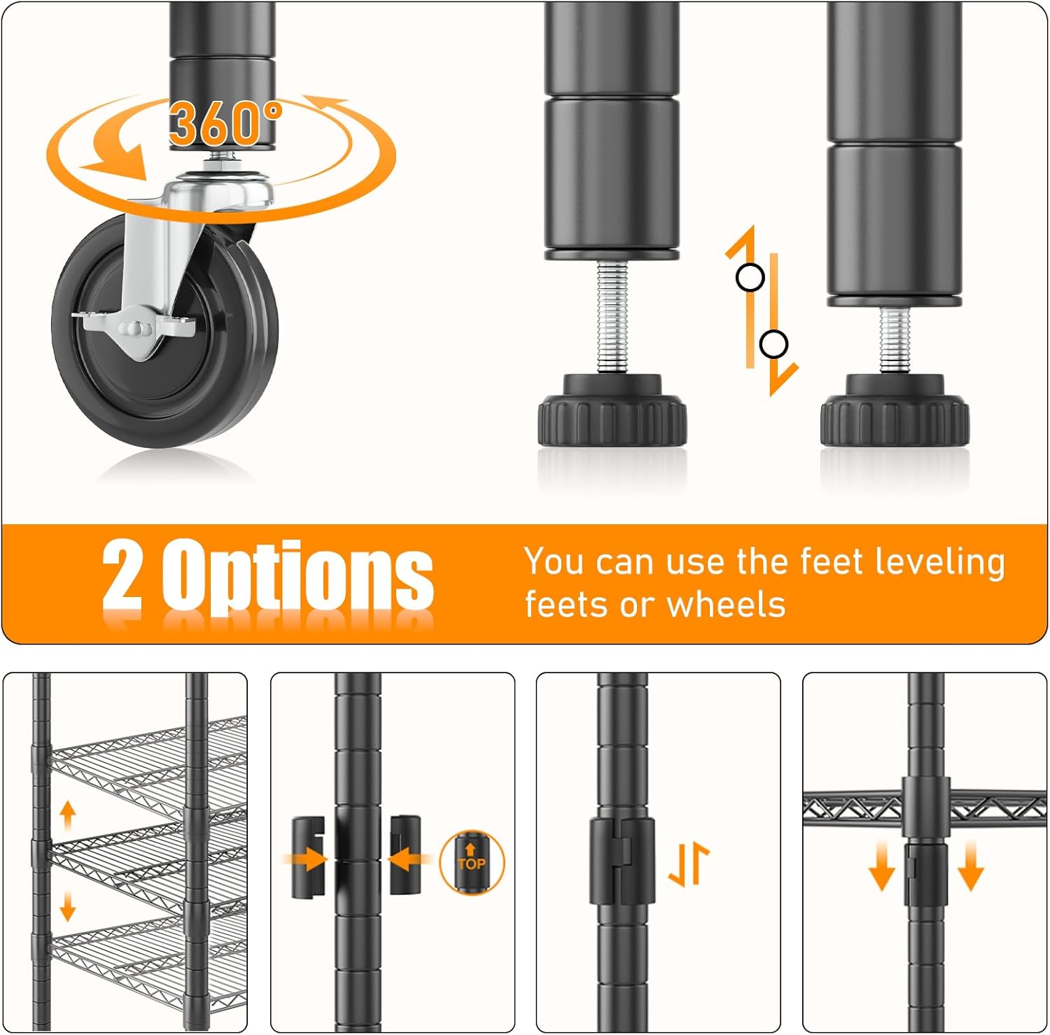 - 【ADJUSTABLE HEIGHT】Each layer of the wire shelf can be adjusted to match the height of your items, optimizing your storage space. Additionally, you can join two storage racks to form a wider unit, providing extra width to meet your needs. No matter your requirements, you can assemble a shelf configuration that fits just right