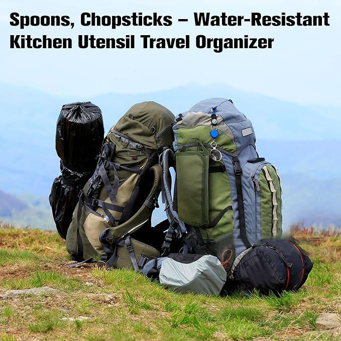 - Travel Tableware Storage: Made of water-resistant polyester, ensuring longevity and resilience. Protect your cooking utensils from chipping or rusting by securely storing them in individual slots inside our roll bag. NOT SUITABLE FOR BIG KNIFE!