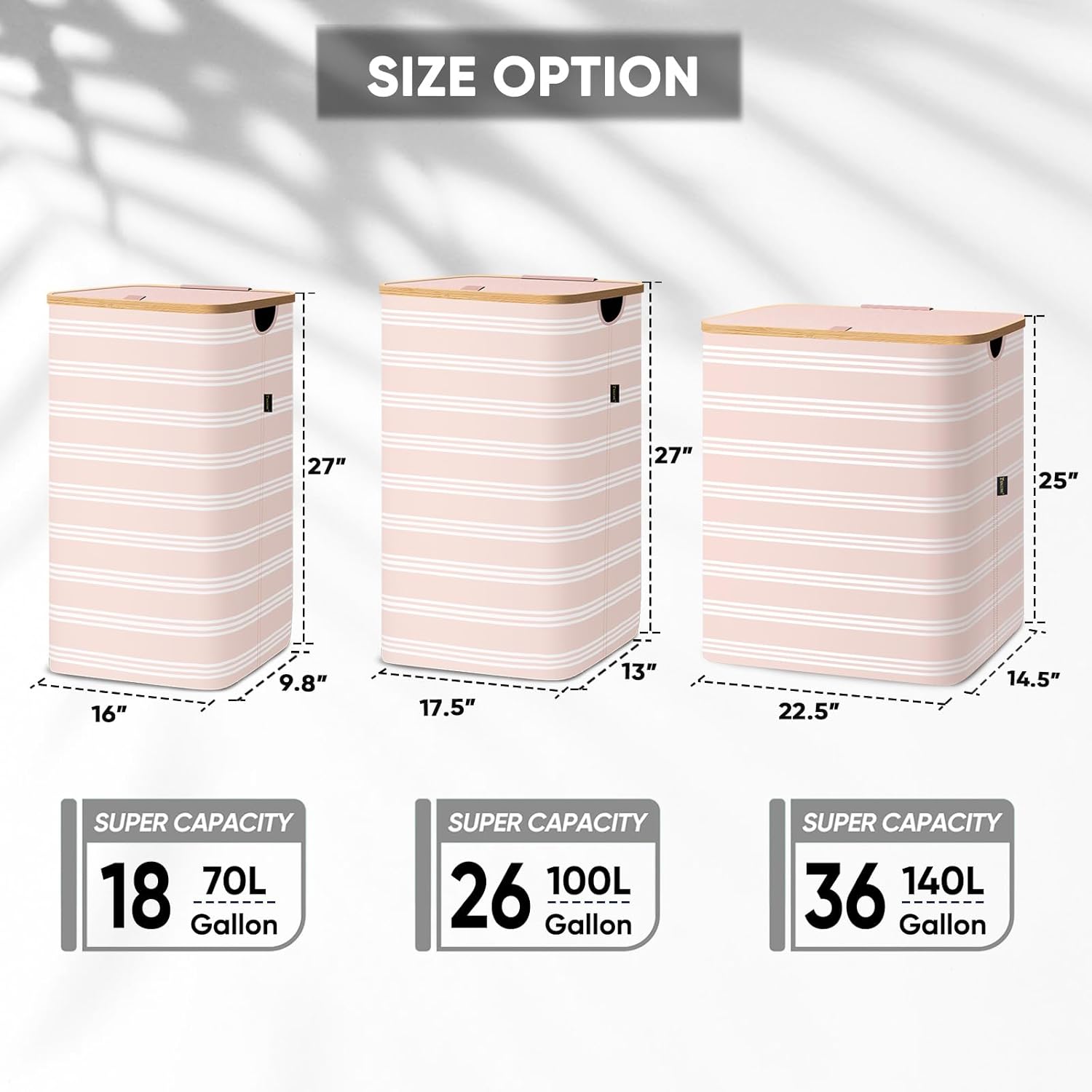 BALEINE Laundry Hamper with Lid, Tall Laundry Baskets with Bamboo Pull Handles, Large Laundry Bin with Internal Support (26 Gal/100L, Pink Pinstripe)
