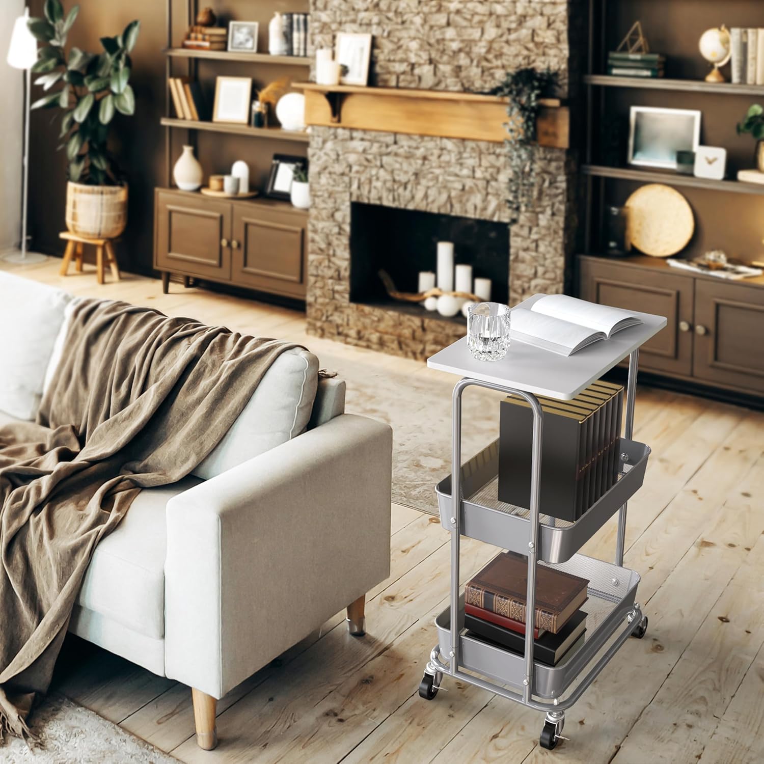 Simple Houseware 2-Tier Rolling Utility Cart with Lockable Wheels and Wood Top, Metal Storage Organizer Trolley for Kitchen, Bathroom, Office, Craft Room, White