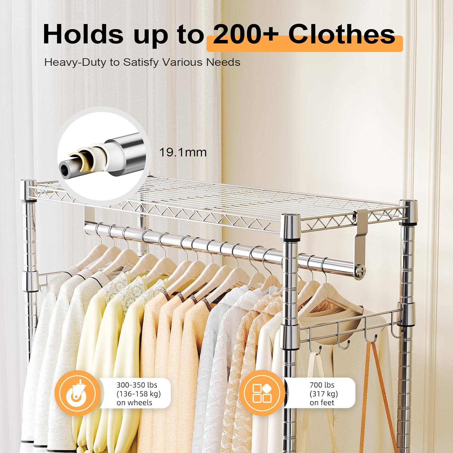 - Lockable 360Β° Wheels And Multifunctional: This rolling clothes rack has 4 heavy-duty rolling wheels, and thus you can easily move anywhere you need, such as the entry closet, laundry room, hallway, balcony, bedroom, cloakroom, bathroom, garage, and more. And 2 of them are lockable, which ensures more safety.