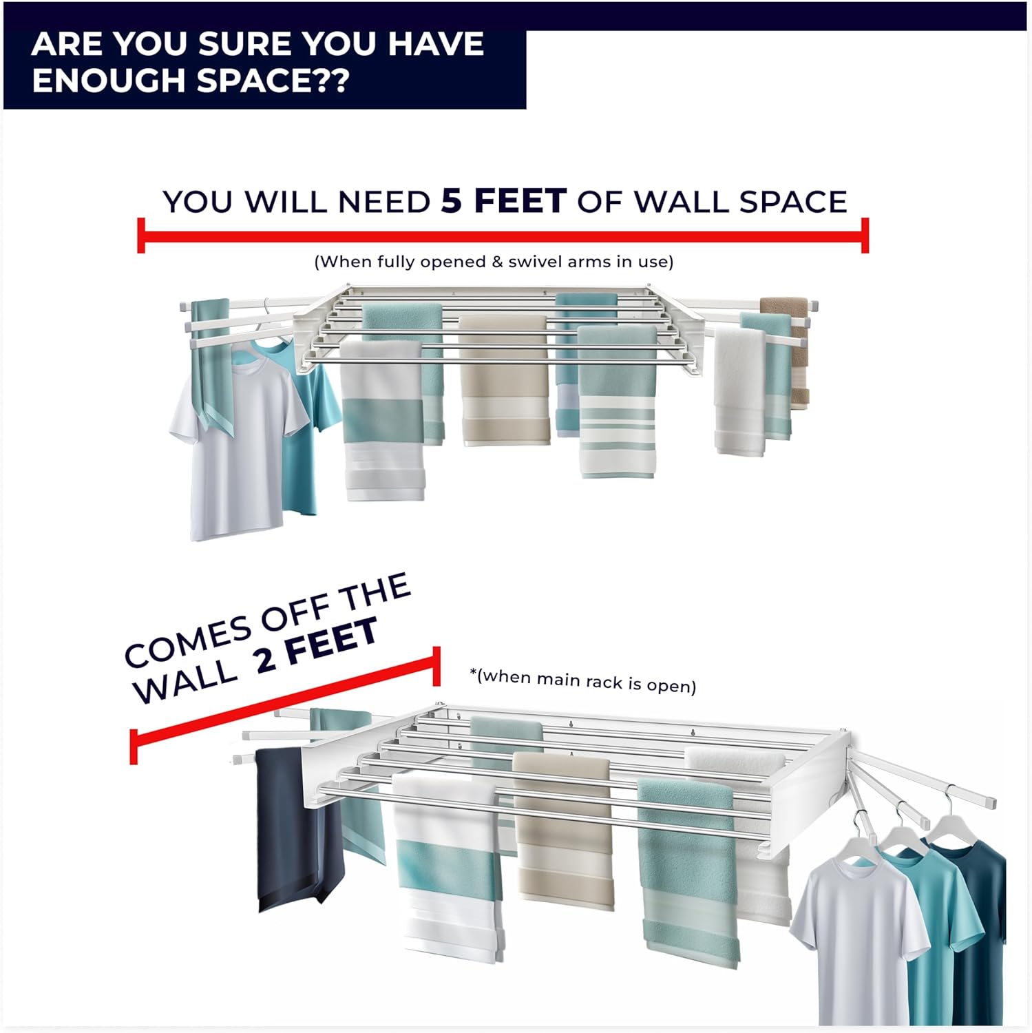 MODERN-X Wall Mounted Clothes Drying Rack with 6 Swivel arms, 35”Wide, 26 Linear ft of Laundry Drying Rack Space, 6 Collapsible Aluminum rods, 2X Drying Capacity, Space Organizer Holds up to 60lbs