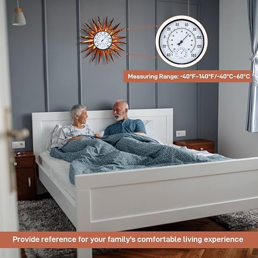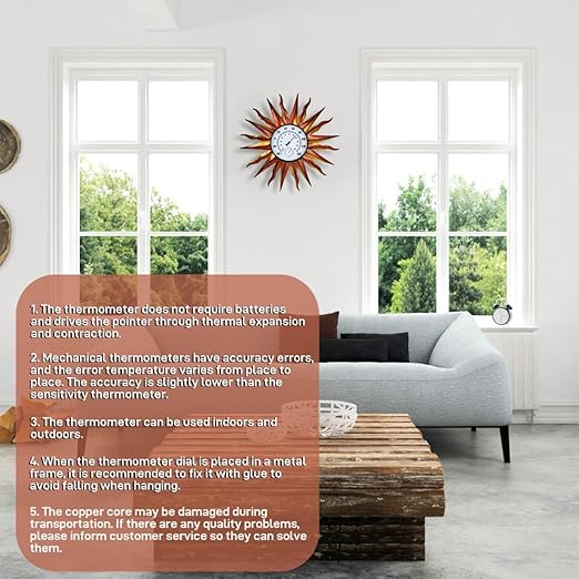- Easy to Assemble: The sun indoor outdoor thermometer can be easily assembled without the help of tools. Match the round metal frame with the holes on the metal corners, tighten them with screws, and finally put in the 9.8-inch dial. Then hang it on the wall to decorate the room