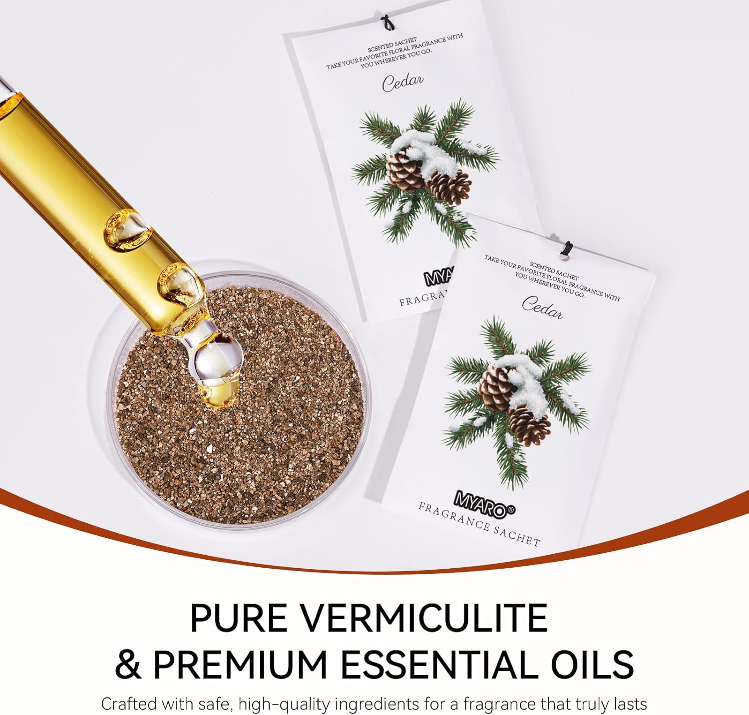 - Refreshing Cedarwood Scent -12 Pack Scented Sachets: Each box includes 12 MYARO cedarwood-scented sachets (4.13" x 2.76"), infused with plant-based essential oils. A clean, woodsy aroma helps refresh your home naturally—ideal for those who love nature-inspired home fragrance