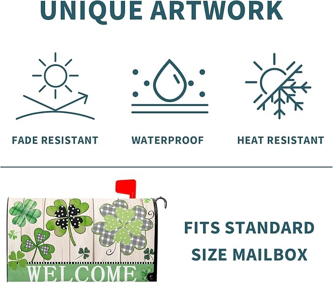 - ✉ FEATURES & ADVANTAGES ---Our Welcome Saint Patrick Day decorative mailbox cover can be used not only to decorate your mailbox but also as a good protective film for your mailbox. Easily protect your mailbox from stains and scratches. There is a soft magnetic strip at both ends, which can be firmly attached to the mailbox. It is very easy to install and no tools are needed.