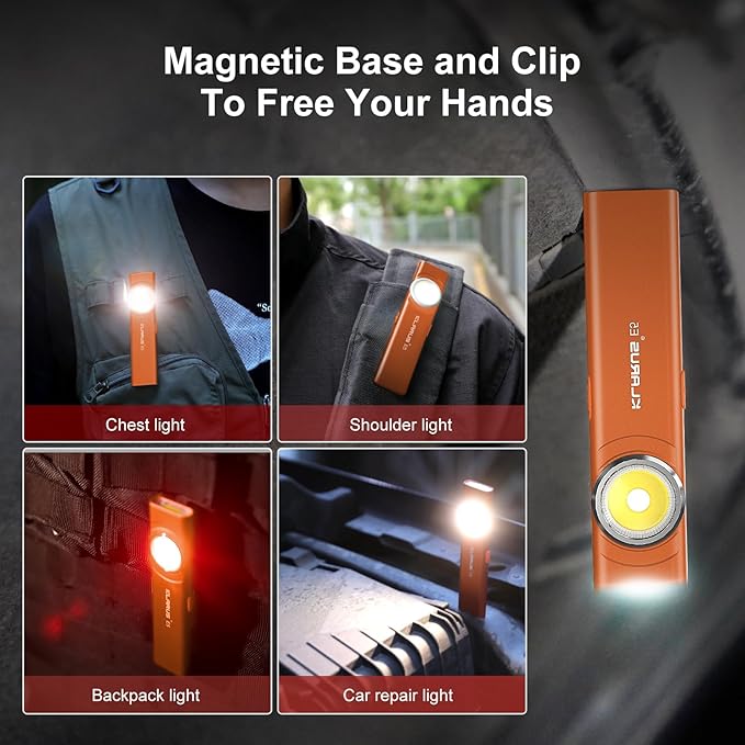 - 【Clip and Magnetic Design】Our work light adopts magnetic base design, which can be firmly attached to various metal surfaces; the clip of the flashlight can also be fixed on belts, hats, tents and other attachments, freeing your hands while stabilizing the use of the flashlight