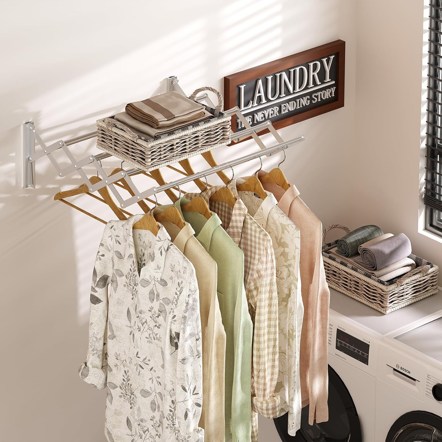 - Compact with Large Drying Space: Wall mounted and collapsible expandable design for max space helper, just expand when air drying; 8 rods 23 linear feet offers adequate hanging drying space.