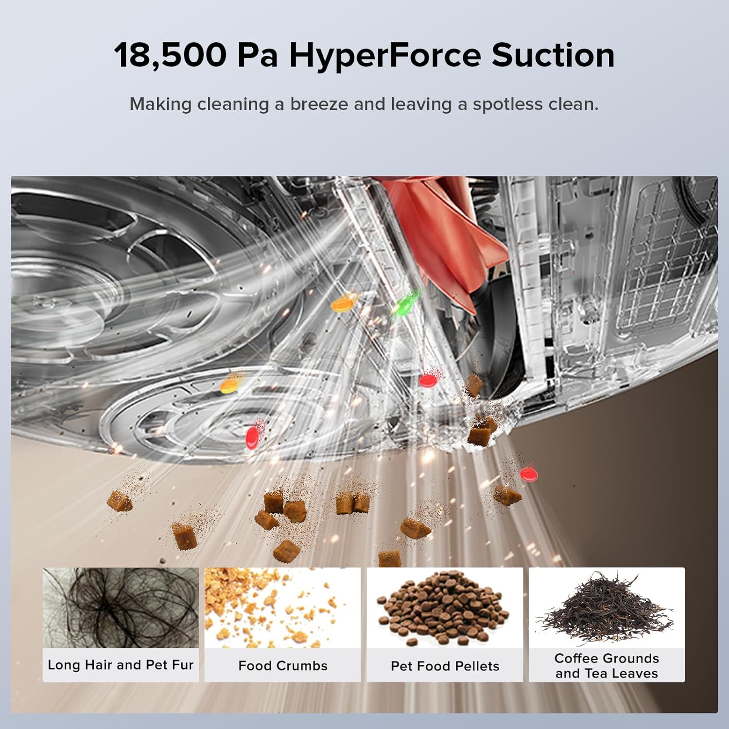 - Unmatched Cleaning Power: With up to 18,500 Pa strong suction, it easily overcomes all cleaning challenges, powerfully lifting hair, debris, dust, and dirt from carpets and hard floors into the dustbin.