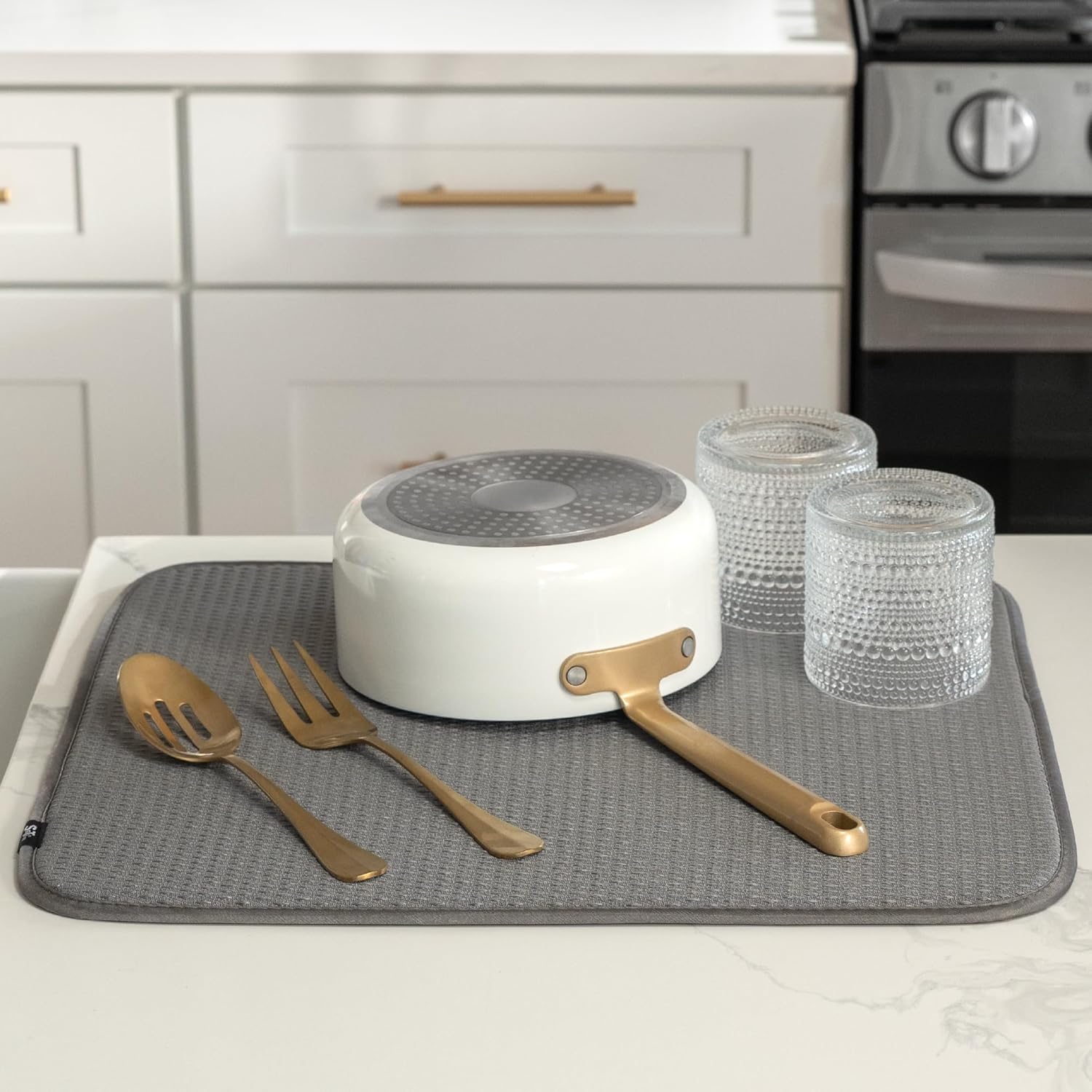 - Catch the kitchen sink drips under a dish drying rack or place your plates, forks, spoons, pots and pans set, or glassware directly on the drying mat
