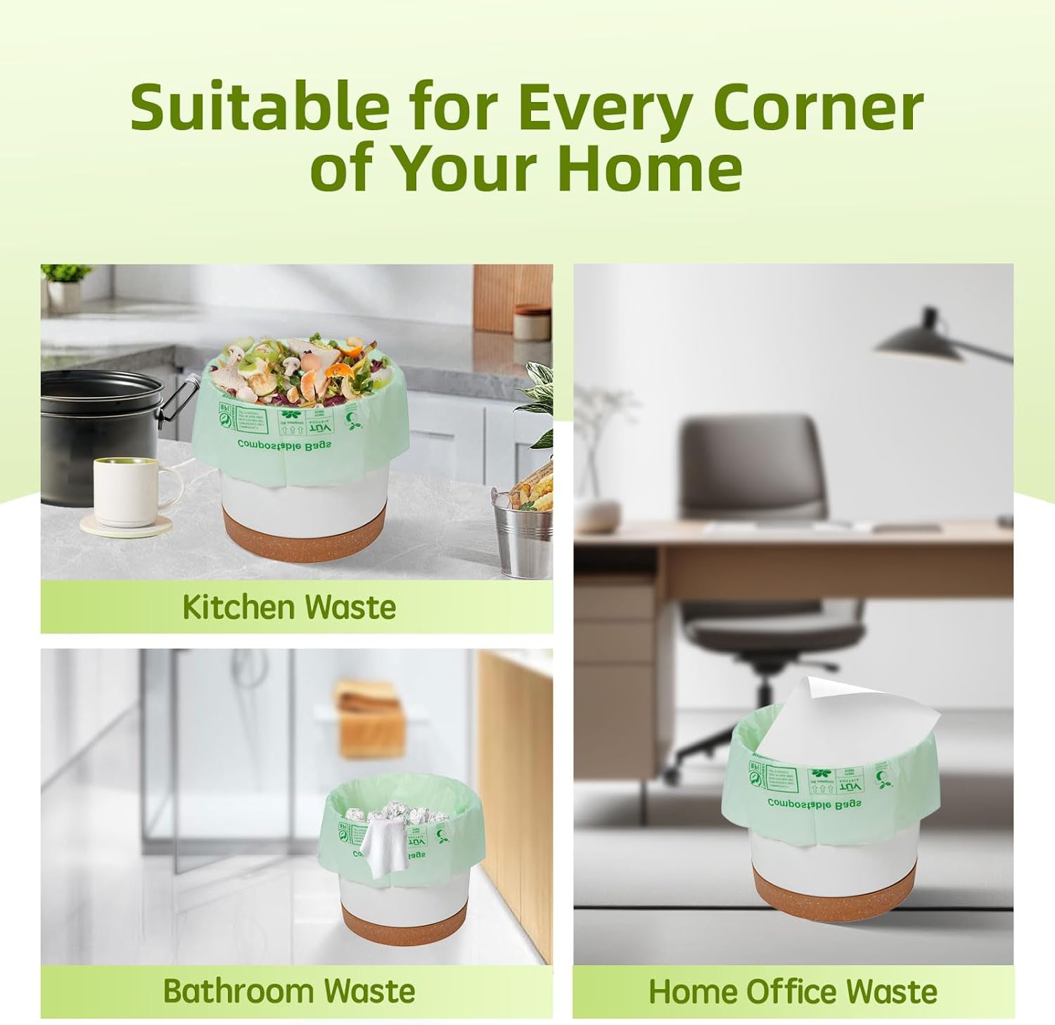 - [CERTIFIED COMPOSTABLE] : Made from certified compostable materials (ASTM D6400), these bags are an eco-friendly choice for composting food scraps and managing organic waste. You may notice a subtle, pleasant scent when opening the package—this is the natural aroma of cornstarch, a key ingredient in these bags.