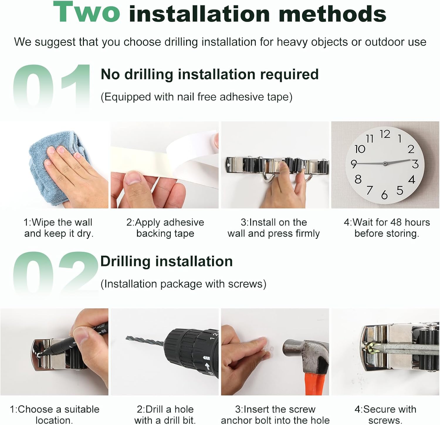 - Premium Material: The broom mop organizer is made of stainless steel, rust proof; scratch resistant and waterproof. It can hold up to 30lbs when mounted with screw holes, and about 8lbs when mounted with self adhesive backing sticker