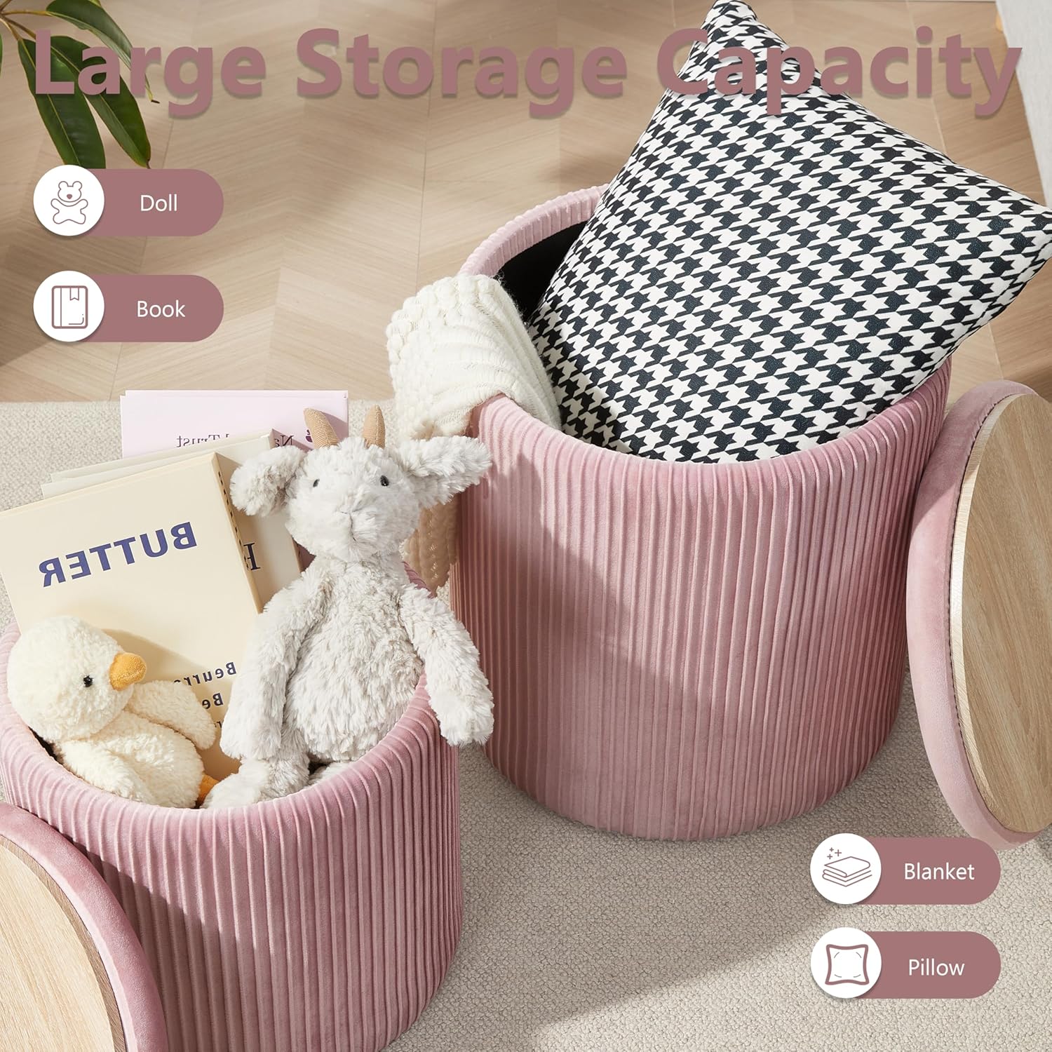 - ćAmple Storage SpacećBoth the large and small ottomans offer generous storage capacity. You can place them in the entryway to store shoes, in the living room for blankets and throw pillows, in the children's room to organize toys, or in the dressing room for cosmetics, bags, and other essentials.