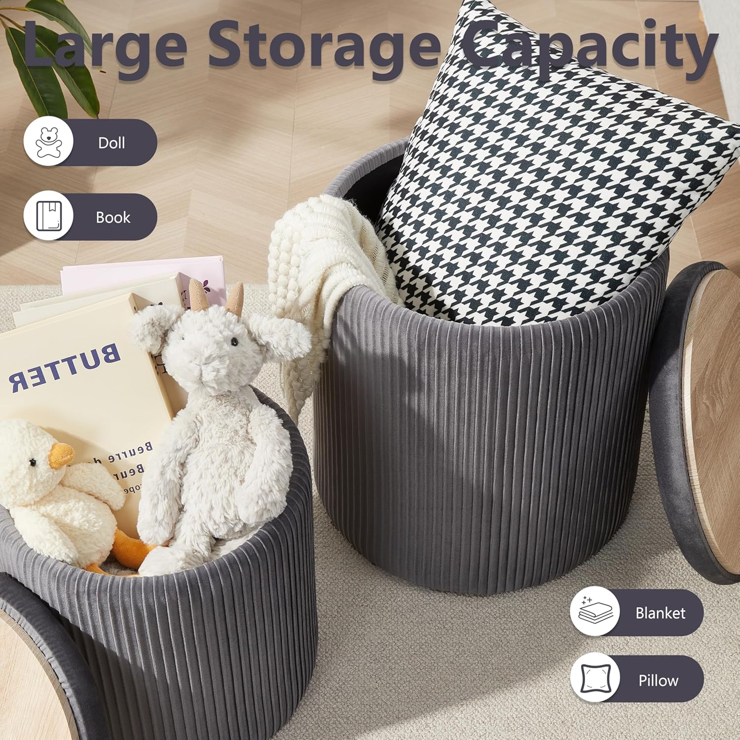 - ćAmple Storage SpacećBoth the large and small ottomans offer generous storage capacity. You can place them in the entryway to store shoes, in the living room for blankets and throw pillows, in the children's room to organize toys, or in the dressing room for cosmetics, bags, and other essentials.