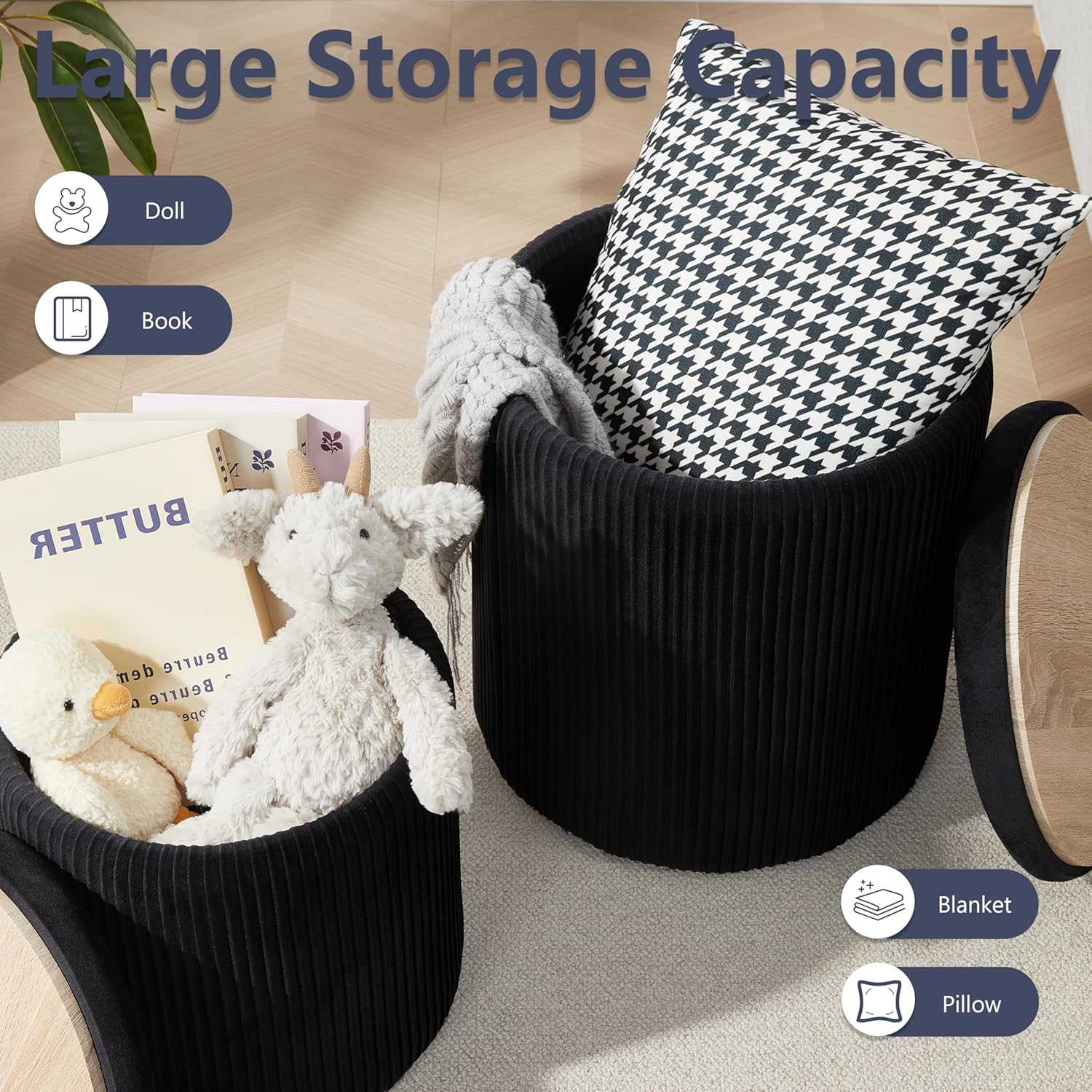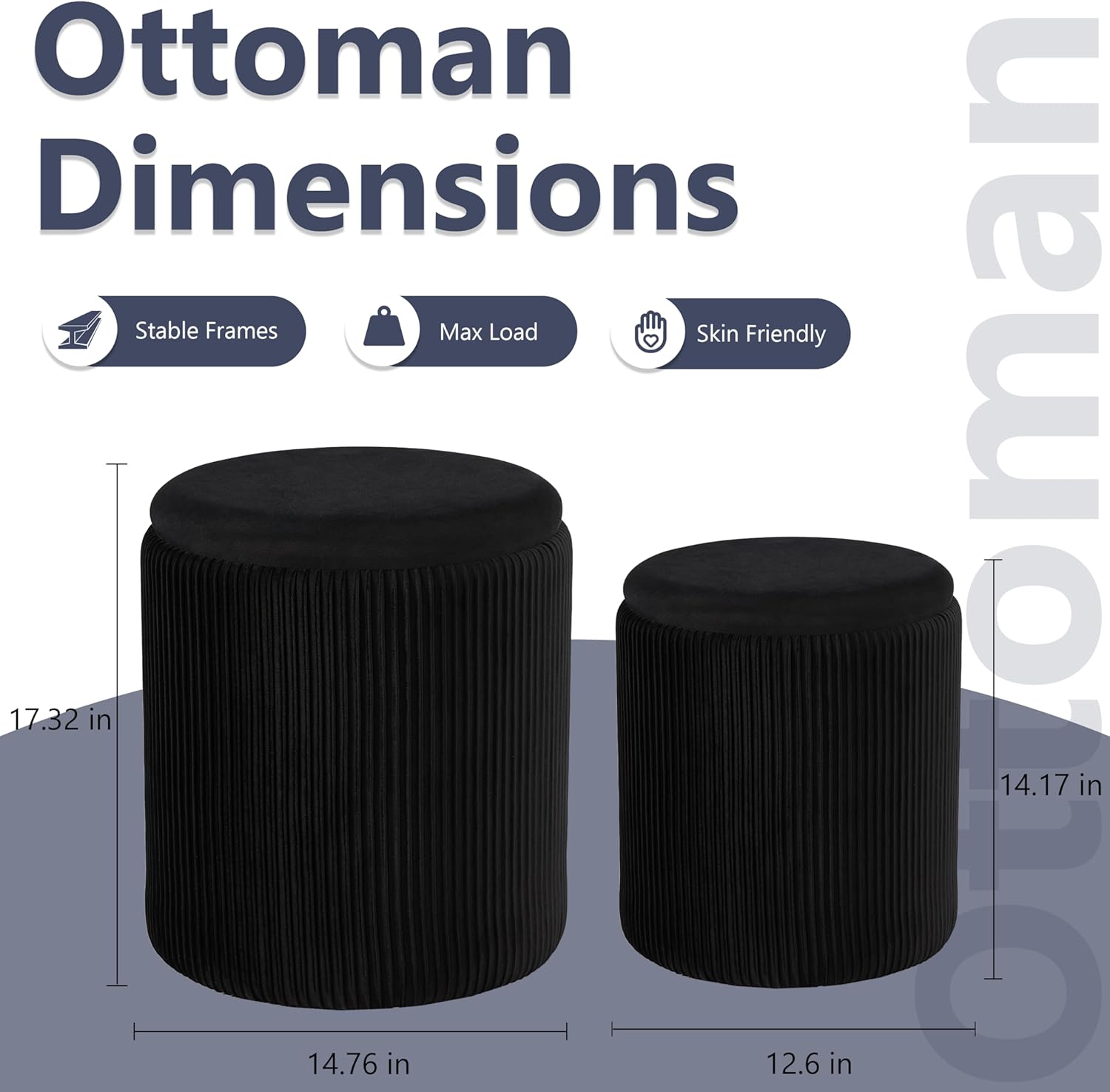 Royal Windsor Round Ottoman with Storage Set of 2,Vanity Stool with Storage for Bedroom, Ottoman Coffee Table,Small Velvet Foot Stool for Living Room, Black