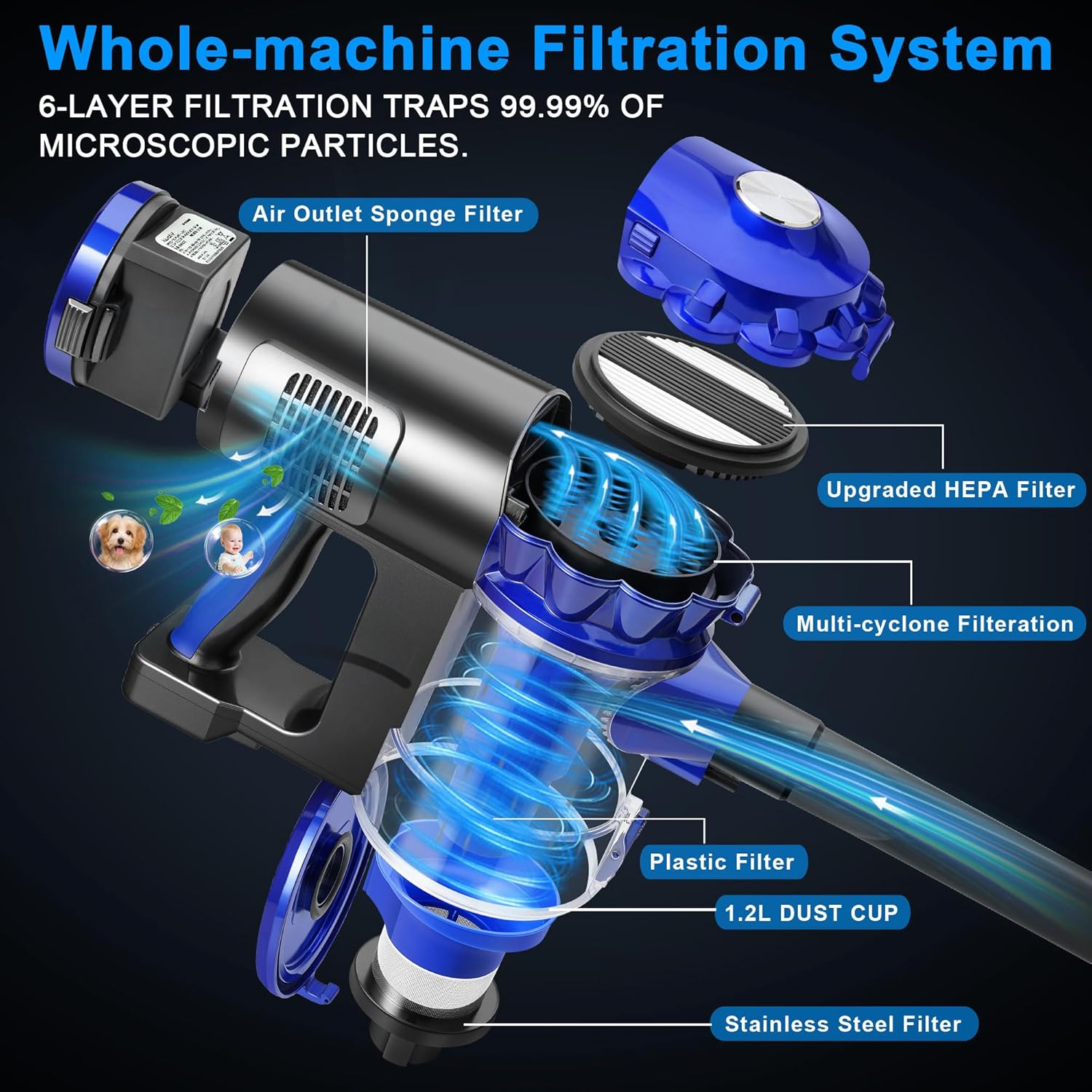 - Efficient Multi-cyclone Filtration System: With a 6-stage sealed cyclone filtration system, the D300 bagless vacuum captures 99.99% of fine particles down to 0.1um. The 9-cone cyclone design prevents fine dust from clogging the HEPA filter and prevents the motor from overheating. This feature ensures you spend less time on maintenance and enjoy clean air when cleaning your home.
