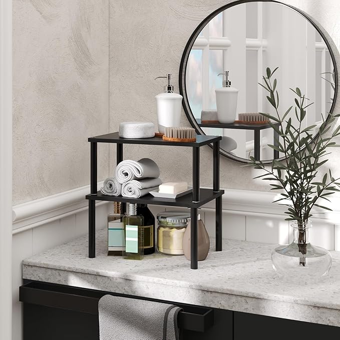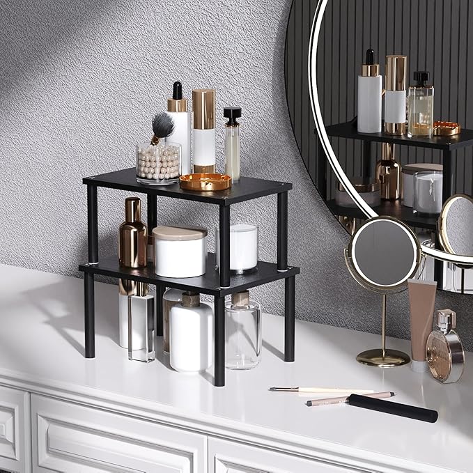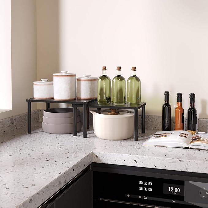 Cabinet Organizer Shelf(Set of 2),Kitchen Counter Shelves,Bamboo Spice Rack Countertop and Cabinet,Stackable Expandable,Medium(Black)