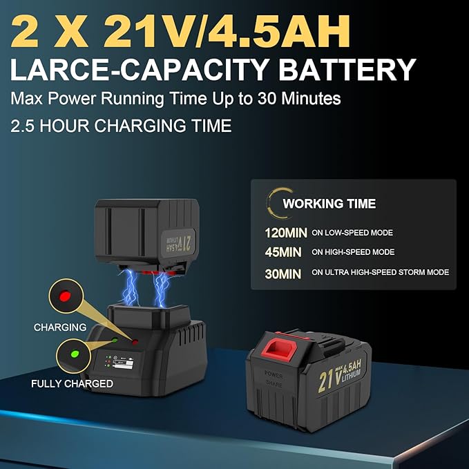 - 2 X 4.5AH LITHIUM BATTERIES: Battery powered leaf blower equipped with two 4.5Ah batteries and a fast charger.In 6 speed turbo-charged ultra-high-speed storm mode, it can work continuously for 30 minutes (each battery can work for 15 minutes on a full charge);in 4 high-speed mode, two batteries can run for 60 minutes;in 1-2 low-speed mode, a single battery can work for 120 minutes (two batteries can work for 4 hours).4.5Ah battery charging time is measured at 2 hours and 30 minutes.