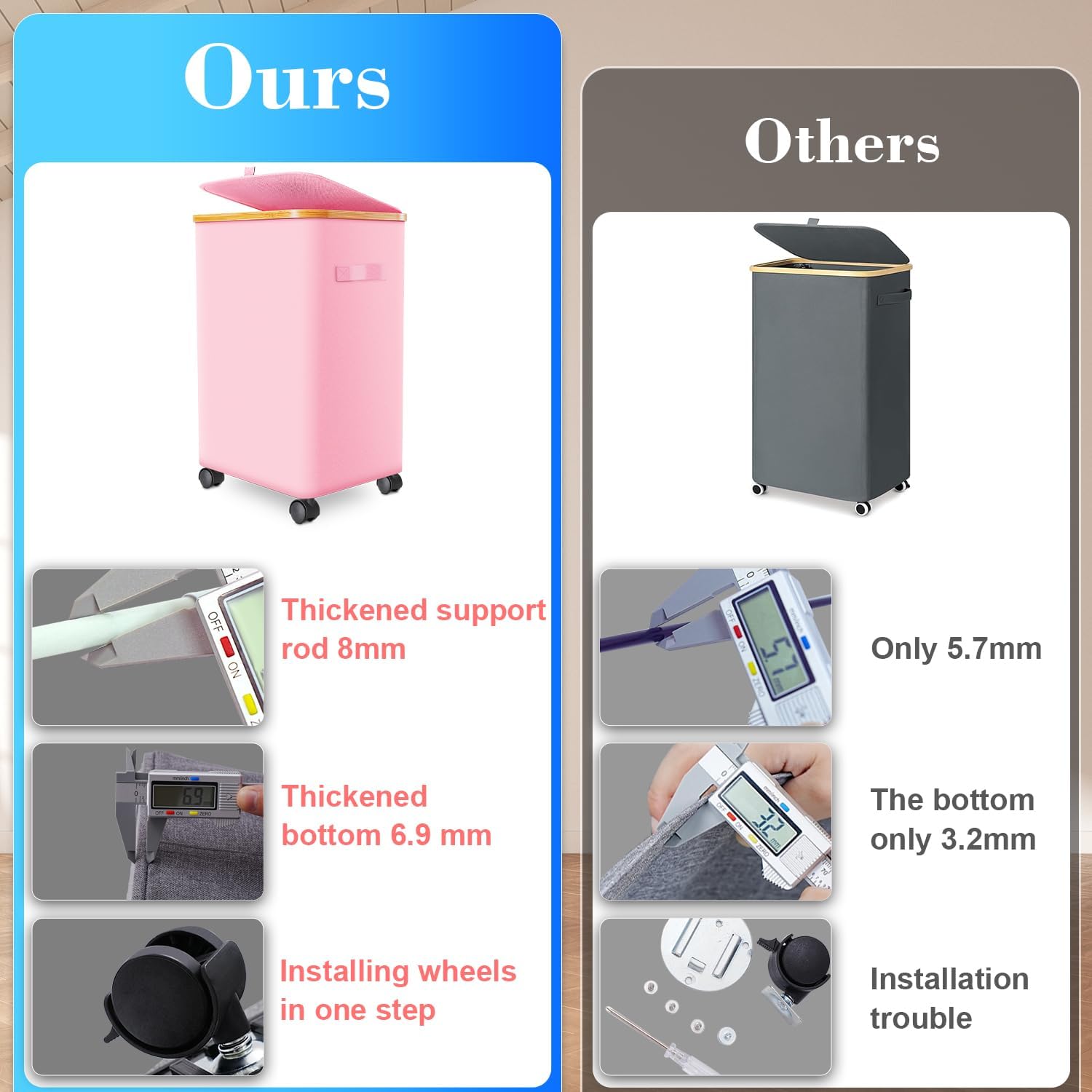 Laundry Hamper with Wheels,29 Gal (110L) Laundry Basket with lid Rolling Clothes Hamper Foldable Dirty Clothes Basket on wheels with Bamboo Frame and Bag for Bedroom, Dorm, Laundry Room-Pink