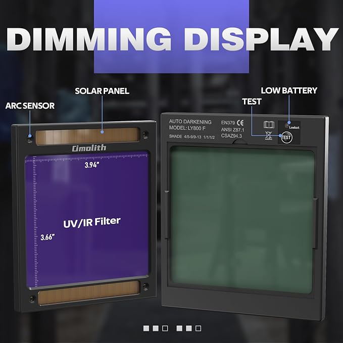 - Auto darkening : 4 Premium Sensors, fast response time. Lithium battery and solar supply.