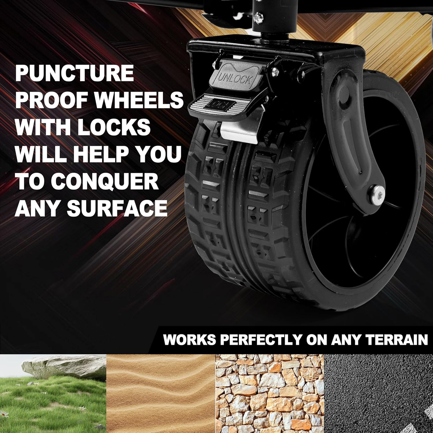 - Navigate through sandy beaches, rocky paths, or your own backyard with the cart's large, foldable beach wheels, designed specially to provide stability and ease over various terrains. Whether it's transporting gardening supplies or carrying picnic essentials, your items will rest secure and undisturbed during transit.