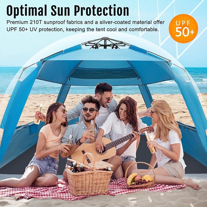 - Outdoor Protection & Great Ventilation - Premium 210t sun-proof material plus a special embedded silver-coated material to provide great UV protection from the sun and 3 added roll up openings maintain airflow to keep the tent cool when staying inside.
