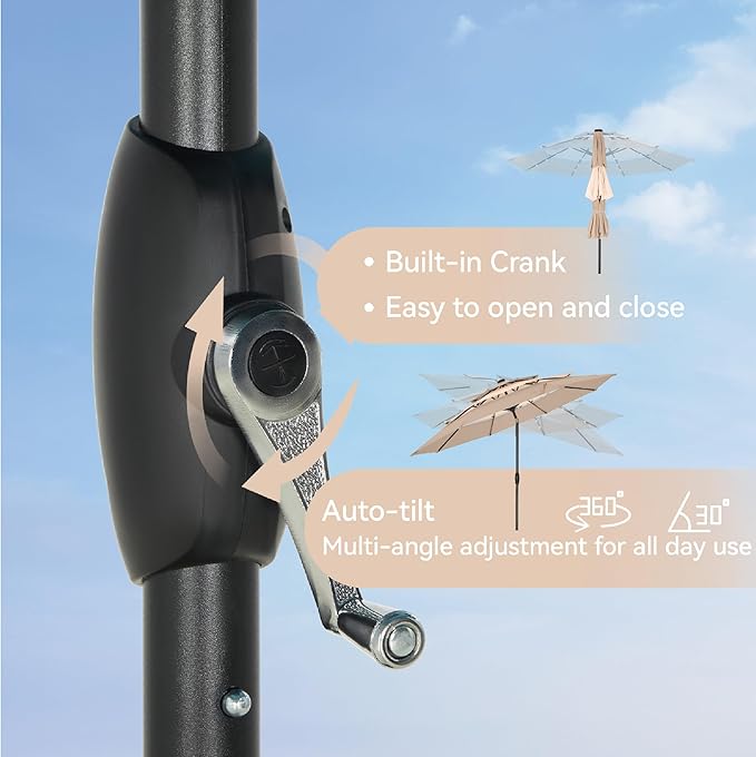 - Easy to Adjust: This umbrella Outdoor patio is designed with crank opening system and easy to adjust, it can be easily opened, closed and tilted from 0-45Β° through the hand crank adjustment, which is easy and quick to use, and it can provide more angle of shade protection and better shading effect.