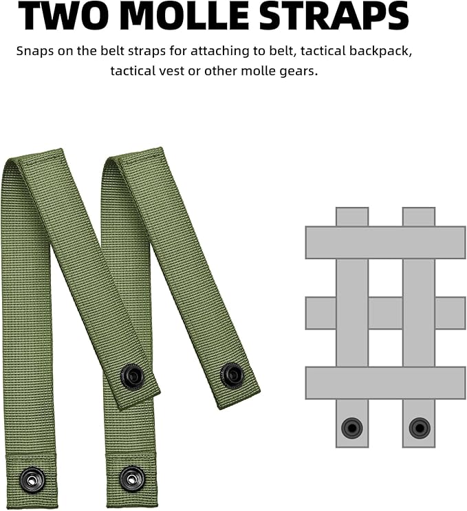 - Multiple Carrying Option:The tactical water bottle holder is equipped with two MOLLE back straps featuring metal snaps, allowing it to be securely attached to MOLLE-compatible gear such as backpacks or battle belts. It also includes a sturdy hook, ideal for holding keys or other small tools