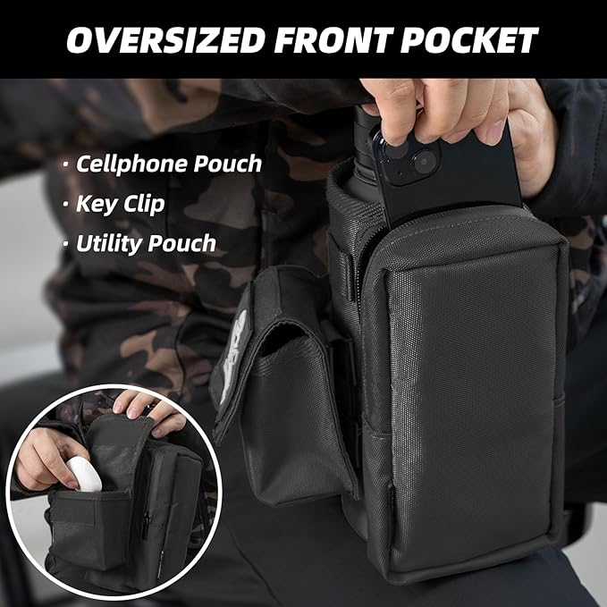 - Two Pocket Design:The large pocket features waterproof zippers, accommodating items like a 7-inch phone and cards securely within a dedicated water bottle pouch sleeve. The small, detachable pocket is ideal for carrying essentials like keys, cash, and small tools, offering both convenience and flexibility