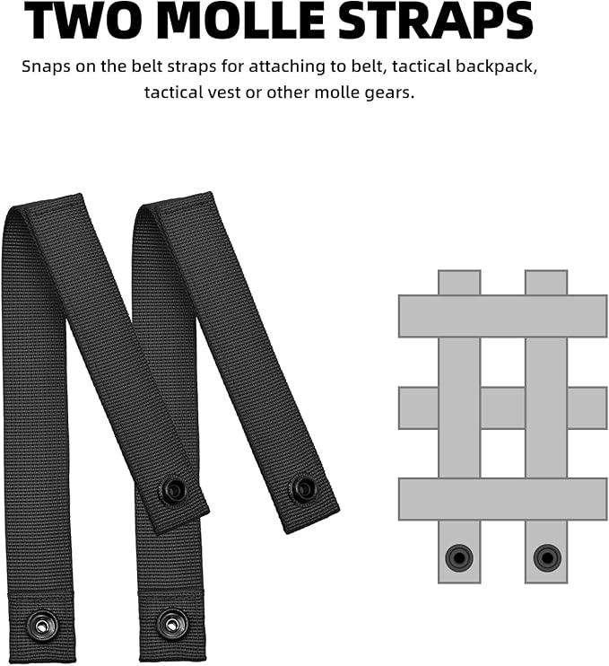- Multiple Carrying Option:The tactical water bottle holder is equipped with two MOLLE back straps featuring metal snaps, allowing it to be securely attached to MOLLE-compatible gear such as backpacks or battle belts. It also includes a sturdy hook, ideal for holding keys or other small tools
