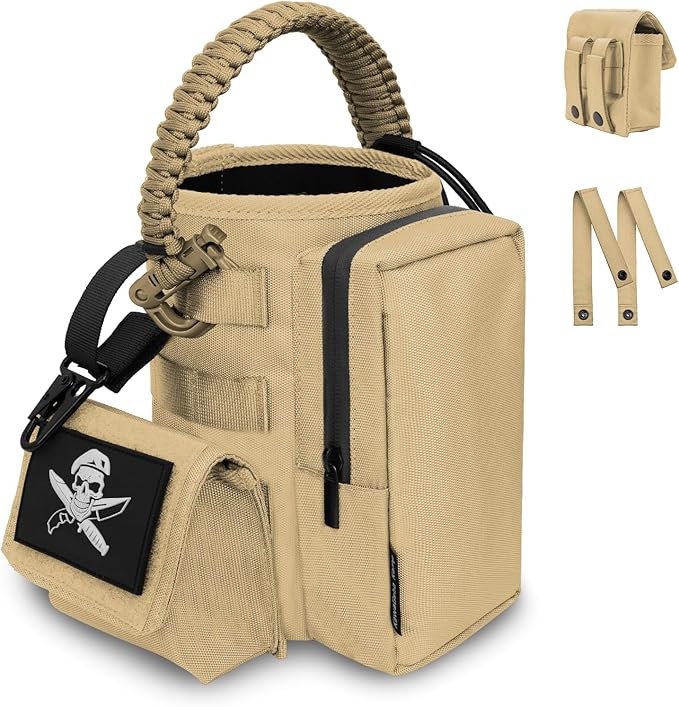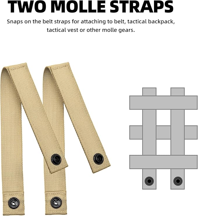 - Multiple Carrying Option:The tactical water bottle holder is equipped with two MOLLE back straps featuring metal snaps, allowing it to be securely attached to MOLLE-compatible gear such as backpacks or battle belts. It also includes a sturdy hook, ideal for holding keys or other small tools