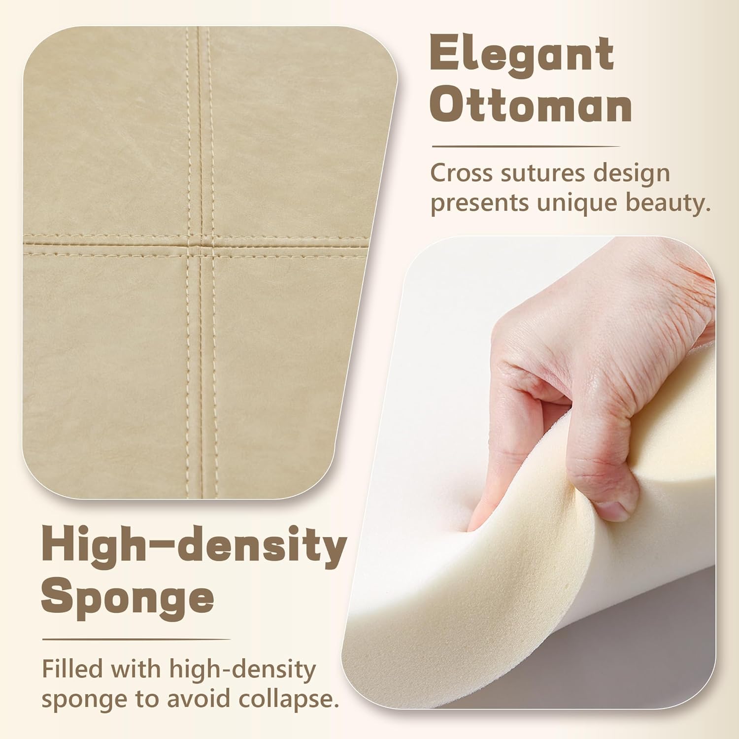 - Exquisite Design: PU leather fabric and hand-stitched top design gives this ottoman coffee table an elegant appearance. There is enough high-rebound sponge inside the top, which keeps the round ottoman full and beautiful. Removing the things from top will not leave ugly indentations