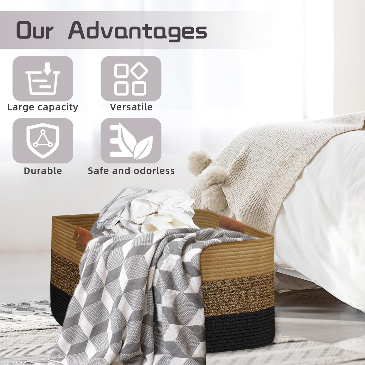 - Decorative & Versatile: Pure Natural Material Elevates Any Space - Laundry, Toys, or Blanket Storage Solution.The elegant leather handles not only take care of your hands but also add a distinctive highlight to our large baskets.