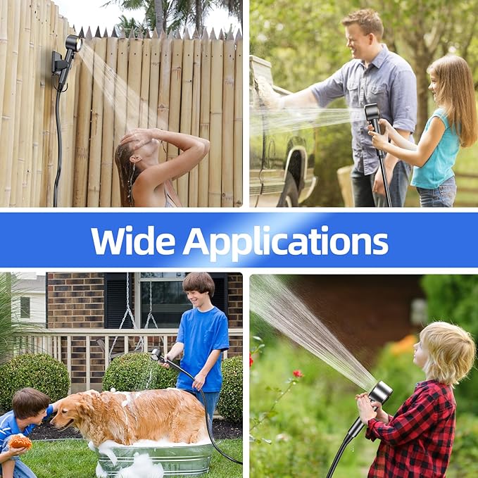 - Compact and Portable: Portable shower kit weights only 2.3LB, includes 1* Multi modes shower head, 1* Spray gun head, 1* Power water pump, 1* 6.7ft Water pipe, 1* Multi-use hook, 1* Type-C charging cable, and a Mesh organizer bag for convenient to carry and store. Ideal for indoor/outdoor showers, camping, BBQ, hiking, beach, trips, bathing, pet bath, car washing, plant watering and more indoor outdoor use