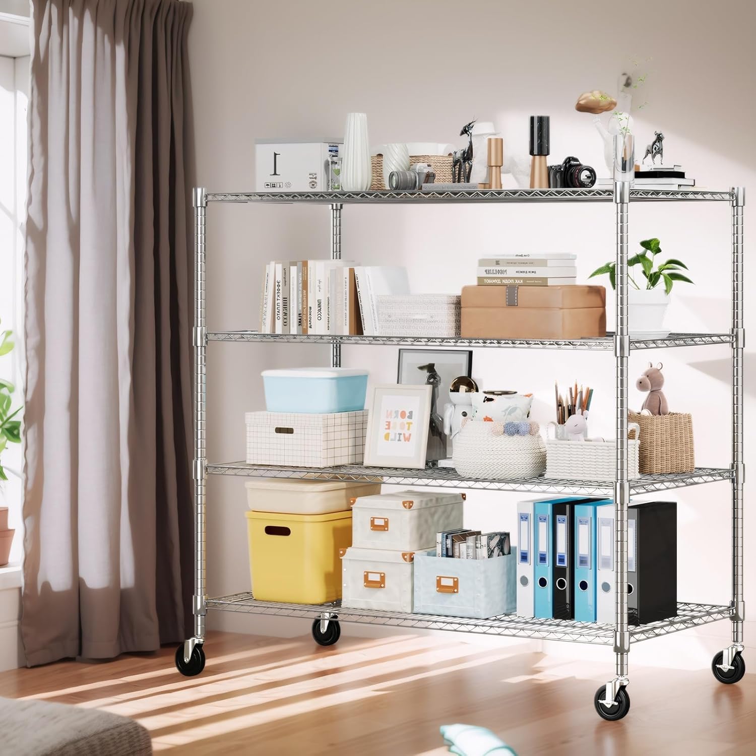 - 【LARGE STORAGE SHELVES】The size of metal shelving with wheels is 24" x 48" x 72" (76"H on leveling feet). This wire shelving can provide additional storage space without occupying too much space.The appropriate size makes the metal shelves for storage suitable not only for kitchens, bathrooms, storage rooms, living rooms, warehouses, basemnet, offices, commercial exhibitions, hotels, supermarkets, etc