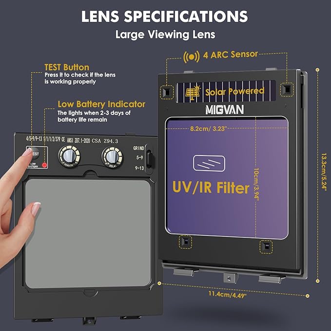 - 【Large Viewing & Auto Darkening】MIGVAN welding helmet boost efficiency with the large viewing screen and 4 premium ARC sensors that activate in 1/10000 seconds. Seamlessly switches from DIN4 (light state) to DIN5-9/DIN9-13 (dark state). Add the advanced outer yellow filter protective lens, ensuring instant protection against harmful UV/IR rays.
