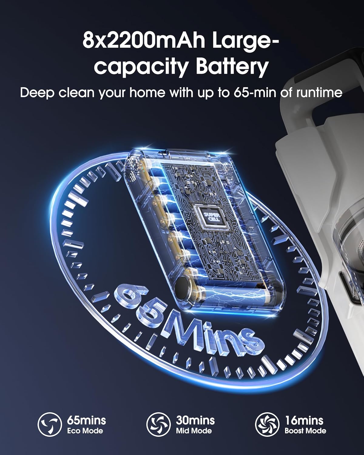 - Extended Runtime for Big Jobs – With fast charging, it fully recharges in ONLY 2.5 hours(Charger Included). Its upgraded 176,000mAh 8-cell battery delivers up to 65 minutes of continuous cleaning in ECO mode, reducing mid-task interruptions so you can cover more ground with fewer breaks.