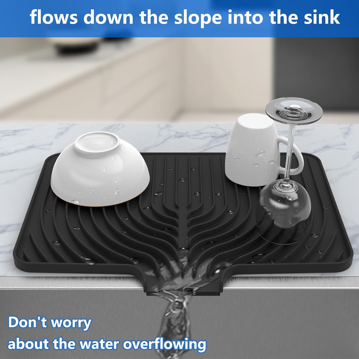 - USE BY YOUR SINK : This silicone dish drying mat equipped a side drain spout and streamlined water guides. Place it by your kitchen sink and direct the water from the dishes into the sink so you don't have to pour out the water from the drying mat.