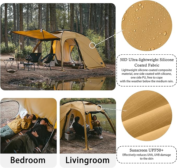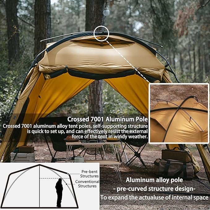 - 【Easy to Set Up】: 3 high-quality 7001 aluminum alloy tent poles are self-supporting, cross-stable and wind-resistant, at the same time, the pre-curved structure of the aluminum alloy tent poles is designed to expand the actual use space inside, it makes you enjoying a large space. Also Easy to disassemble and save your time. And removable inner tent, hall and bedroom switch at will, large space living room tent, provide comfortable space for friends to gather.