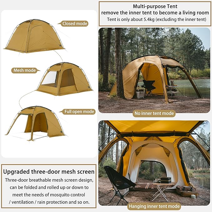 - 【Upgraded 3-Door Breathable Mesh Screen】 The 3-Door Breathable Mesh Screen can be folded and rolled up or down when the tent is in use to meet the needs of ventilation, rain protection and other needs.It weights 7.2kg(including accessories)/15.8lbs(regular model), 7.5kg(including accessories)/16.5lbs(upgrade model), you can easily carry it with the carry bag and store it without taking up much space.
