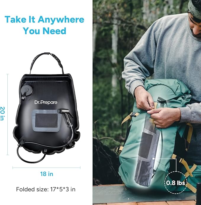 DR.PREPARE Camping Shower Bag, 15L Solar Camp Showers for Travelling Hiking Trip Beach w/On-Off Switchable Shower Head