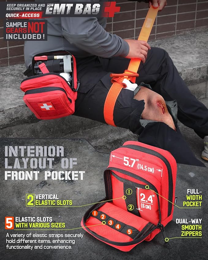- VERSATILE ORGANIZATION OPTIONS:The front pocket of the first aid pouch features an interior pocket, two vertical elastic loops, and five elastic loops of varying sizes to securely hold gauze, gloves, markers, and other small medical items. Its compact interior layout is designed for quick access, providing immediate care for minor injuries or traumatic emergencies.
