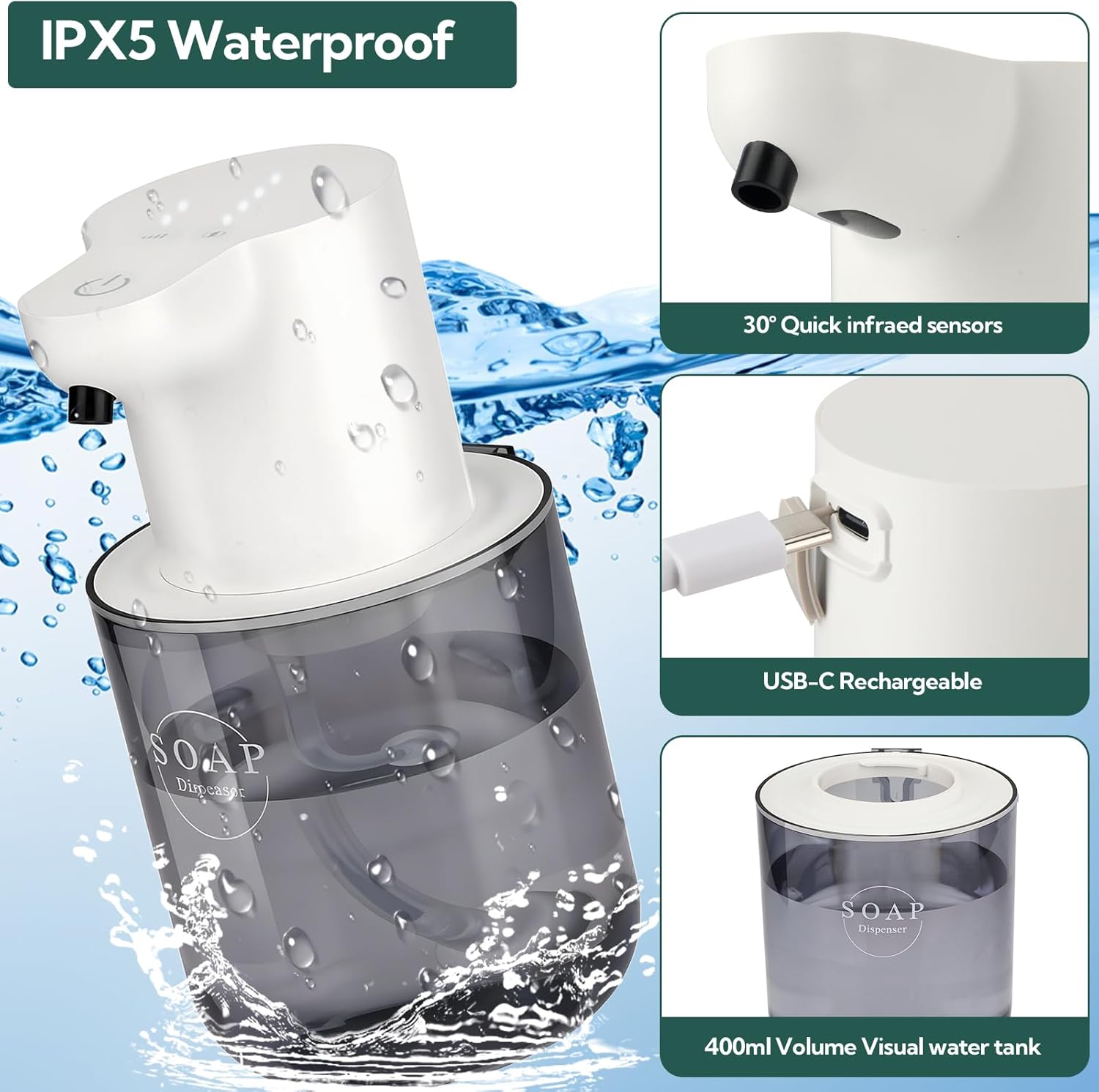 - 【IPX5 Waterproof & Leak-Proof Design】The IPX5 waterproof rating protects the dispenser from soap and water damage, while the rubber plug covering the USB charging port ensures leak-proof performance, making it reliable for use in wet environments like bathrooms and kitchens.