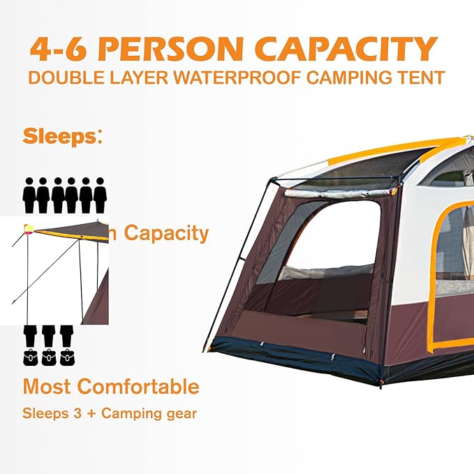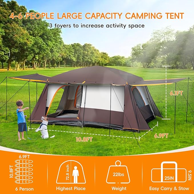 - Roomy 4-6 Person Family Tent: This spacious camping tent has two separate rooms for added privacy and can comfortably accommodate 4-6 people. The tent measures 10.8' x 6.9' x 72.8β (H) (74.5 sq. ft.) which allows for 2 queen size air mattresses or 4-6 sleeping bags depending on size. Ideal for family outdoor camping.
